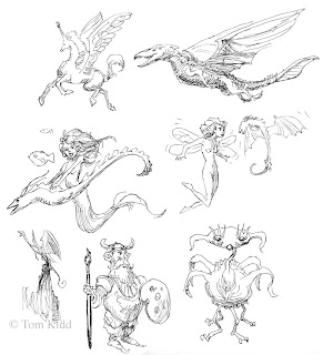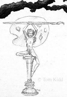 At some point I started thinking I'll use a few of these as remarques in my two how-to art books OtherWorlds and How to Draw and Paint Dragons, hence the paint brushes and palettes appearing.